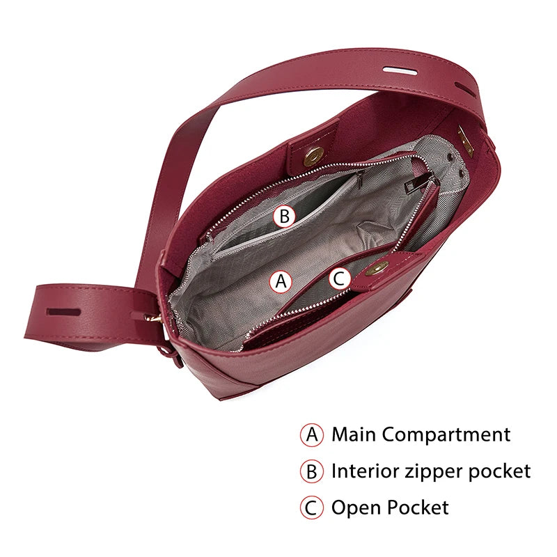 Discover refined functionality with this women's bucket bag, expertly crafted from split leather for durability and sophistication. The generously proportioned silhouette accommodates laptops, wallets, cosmetics, and daily essentials while maintaining a streamlined aesthetic. Multiple organizational features—including an interior zipper pocket, dedicated compartment, and slip pocket—keep your belongings systematically arranged. The dual carrying system comprises a structured top handle and removable shoulder strap, enabling seamless transition between handheld and crossbody styling. Polyester lining provides practical protection for your valuables. An essential investment for the discerning professional seeking a versatile accessory that balances contemporary design with everyday practicality.